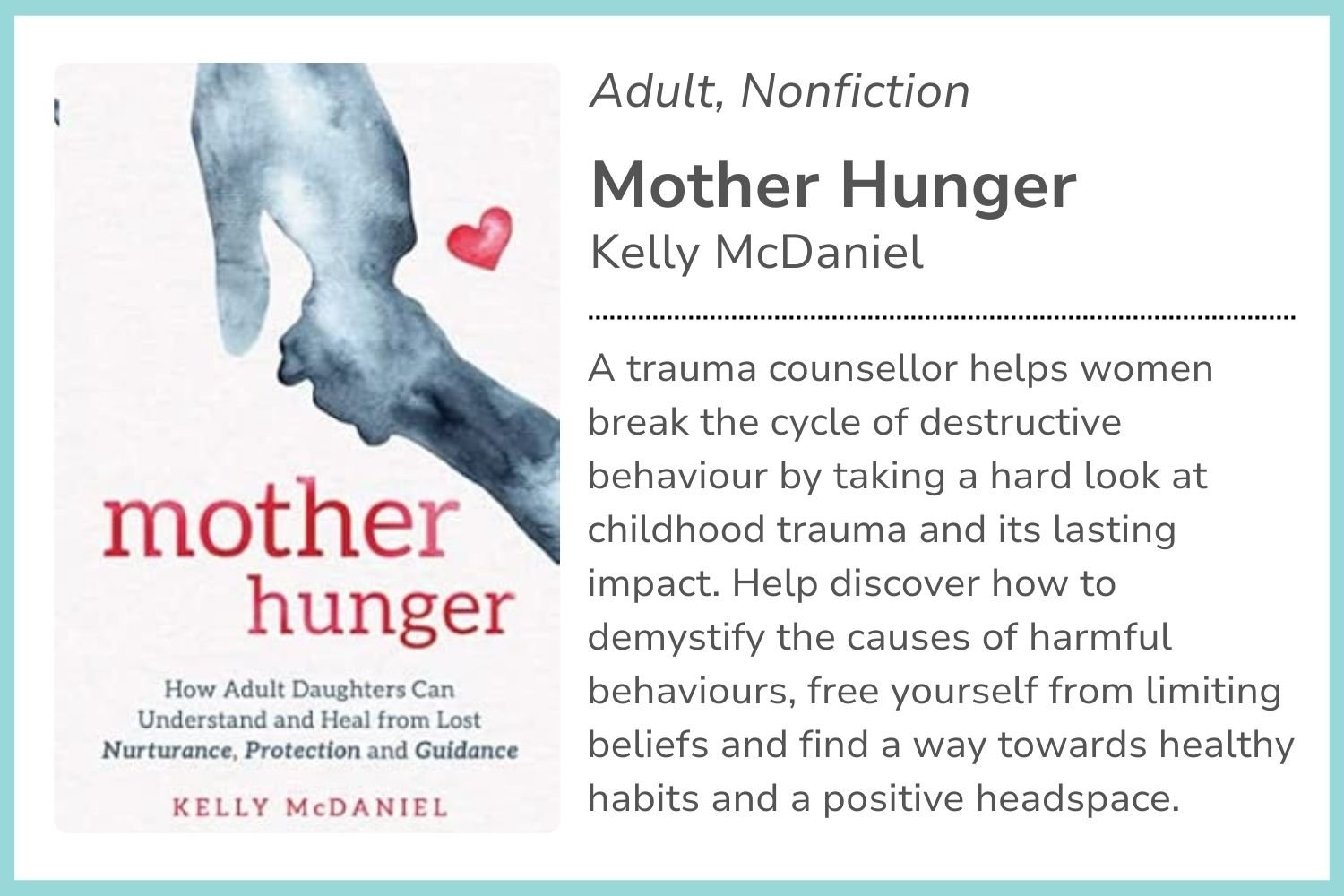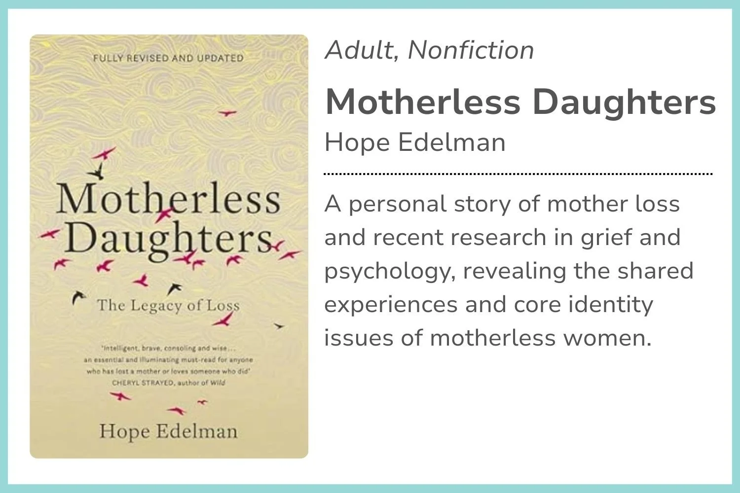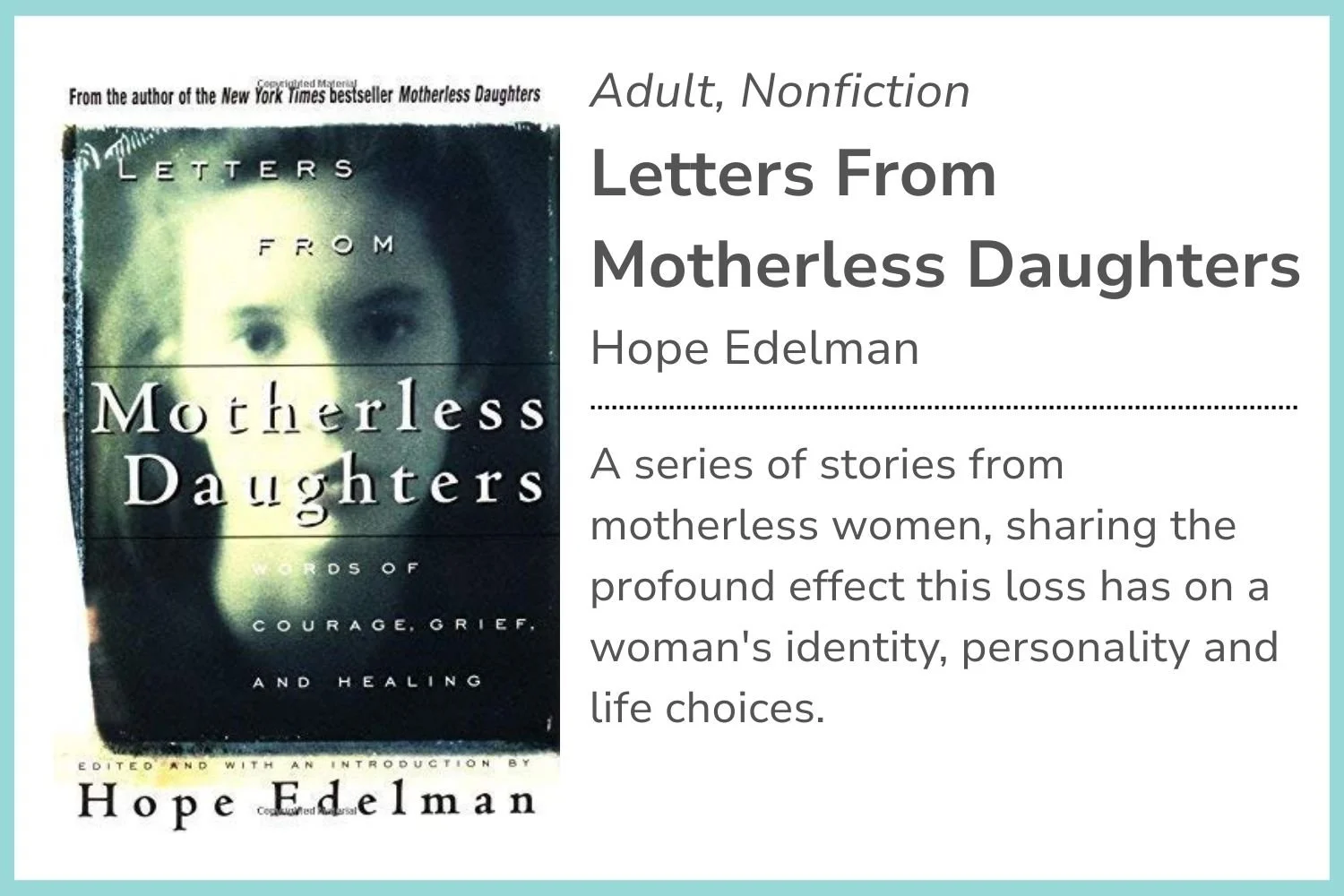 We’re always looking for recommendations to add to our library of resources for motherless mothers. Please fill in the form to add yours.